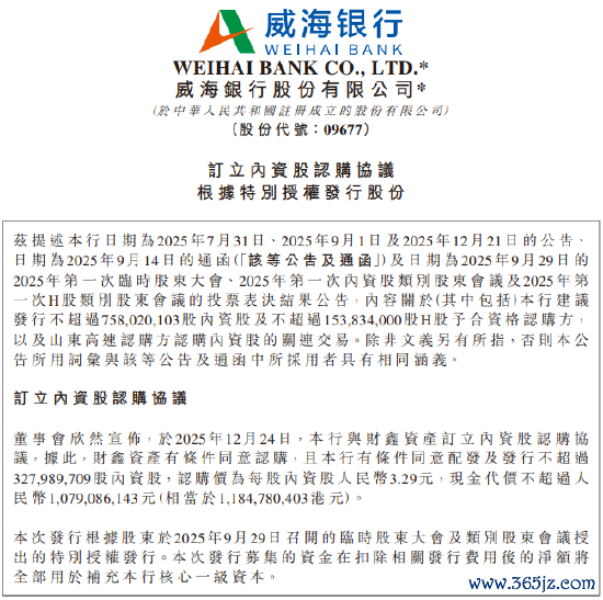 12月24日金融一线音书,威海银行公告称,12月24日,该行与财鑫财富签订内资股认购公约,据此,财鑫财富有条目高兴认购,且该行有条目高兴配发及刊行不率先约3.28亿股内资股,认购价为每股内资推进谈主民币3.29元,较本公告日香港联交所所报收市价每股H股3.07港元溢价约17.59%,现款代价不率先东谈主民币约10.79亿元。